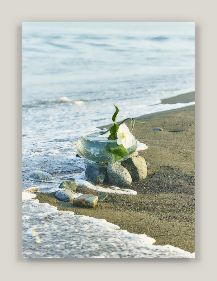 完全な自然空間の中で、いけばな作品は、人の手による不自然さを纏った存在として見えてきます。また、水と生物は切り離 せない関係ですが、海水は植物にとって害のあるもの。一見すると自然に見えるものの中に潜む不自然さは、現代を生きる私 たちに様々なメッセージを投げかけてきます。